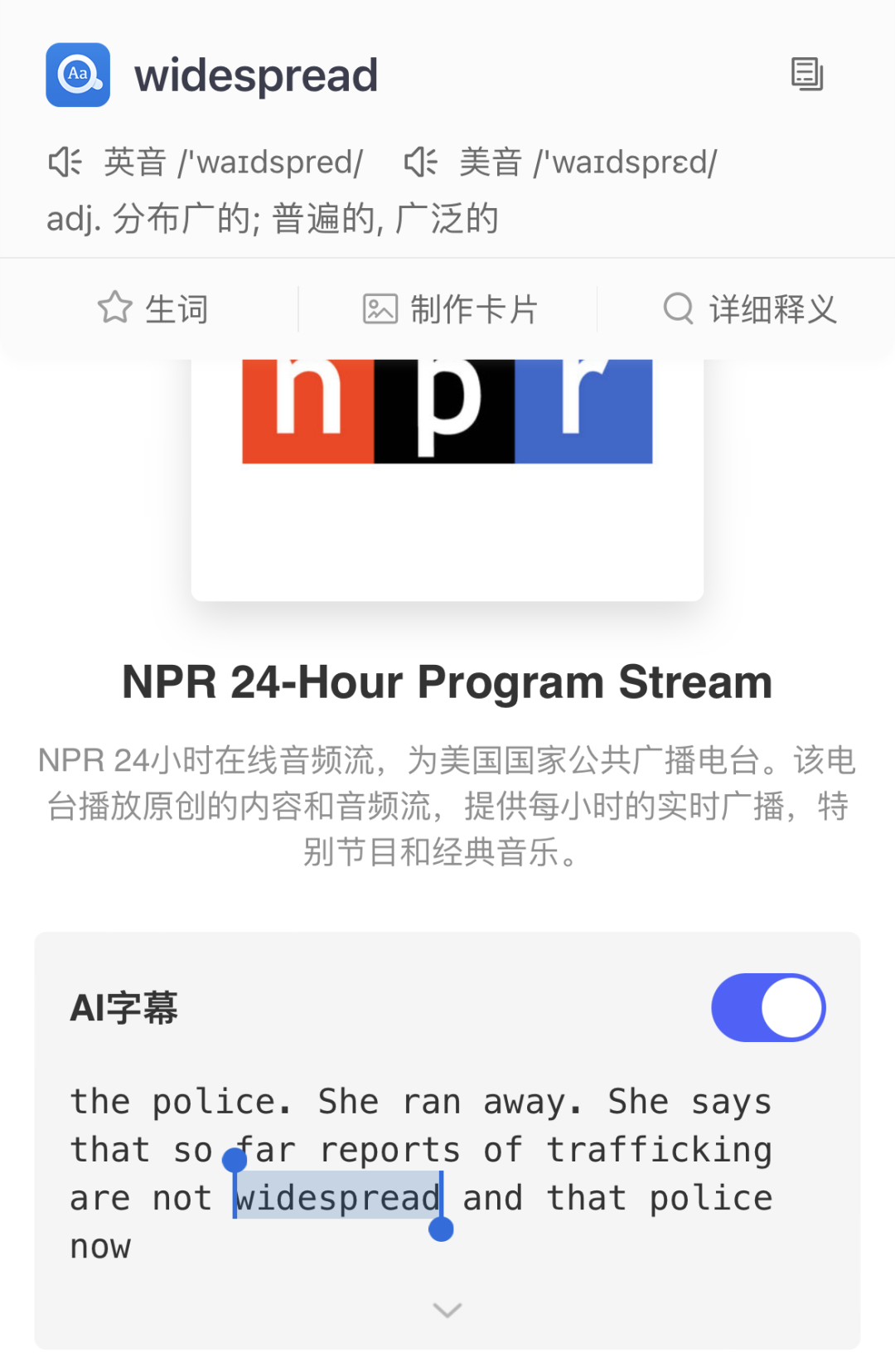 FM英语广播支持AI智能识别字幕文本啦!最新FM新闻报道+实时同步AI字幕,简直是锻炼听力的不二之选~长按字幕还可直接查词,再也不怕听新闻听不懂啦!