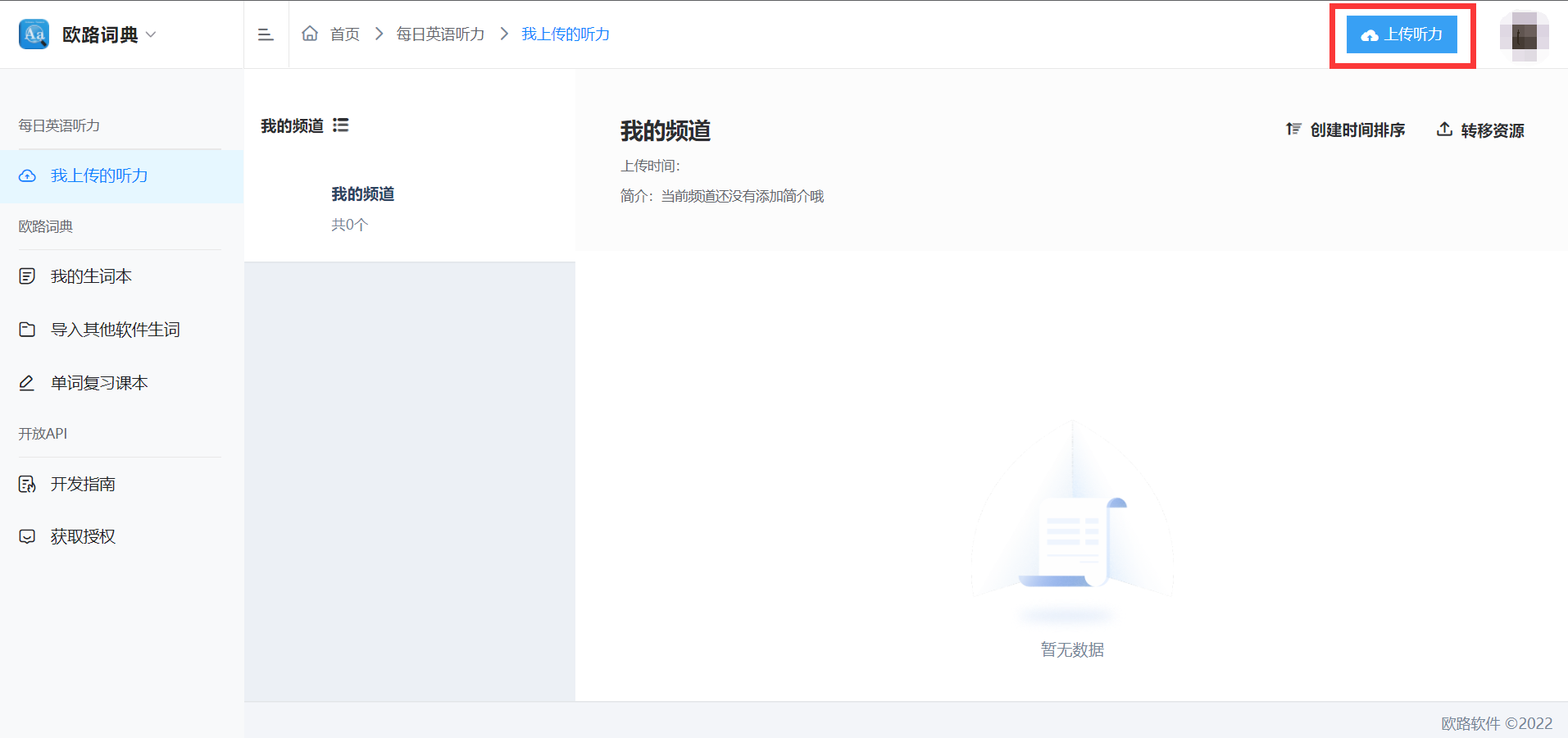 用电脑登录「每日英语听力」的用户后台:my.eudic.net,点击左侧【我上传的听力】,再点击该页面右上角【上传听力】,即可进入上传听力页面。