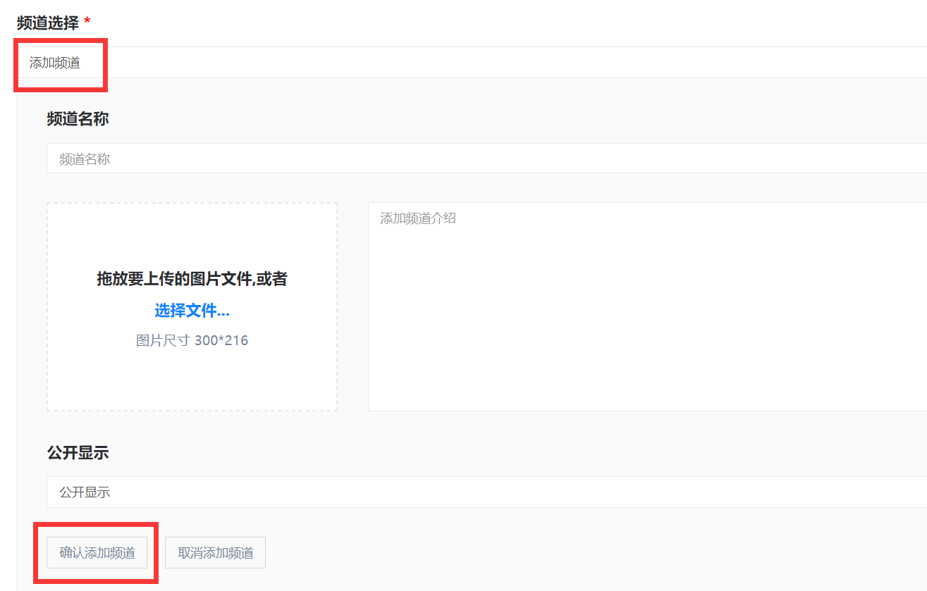 若还未创建过任何频道,需先填写下方【频道名称】、【添加频道介绍】、【添加封面图片】等信息,然后点击【确认添加频道】,此时频道创建成功,再点击上方【添加频道】即可选择方才创建的频道。
