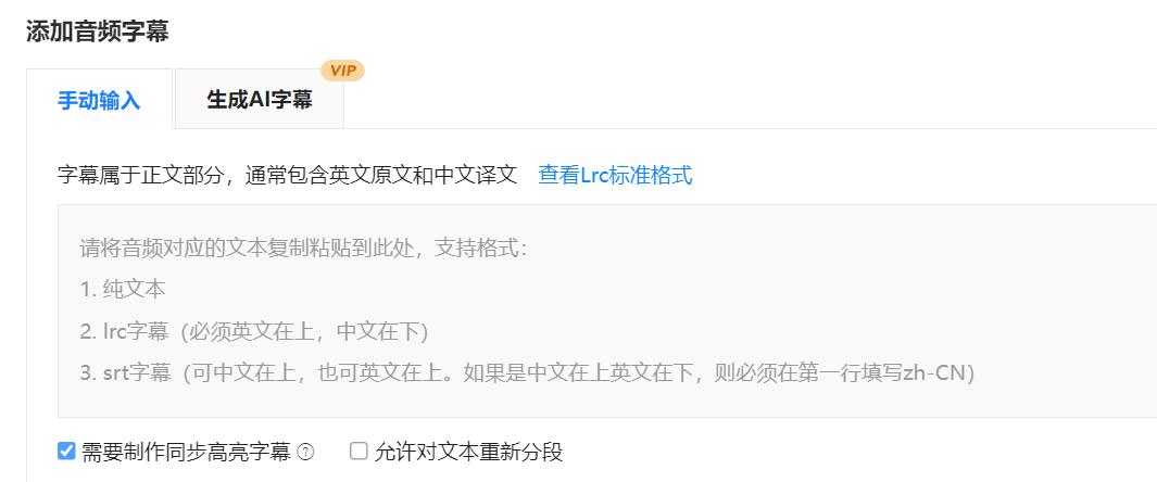 如果需要制作同步高亮字幕,只需要在【添加音频字幕】处,将字幕复制到文本框内,勾选【需要制作同步高亮字幕】即可。