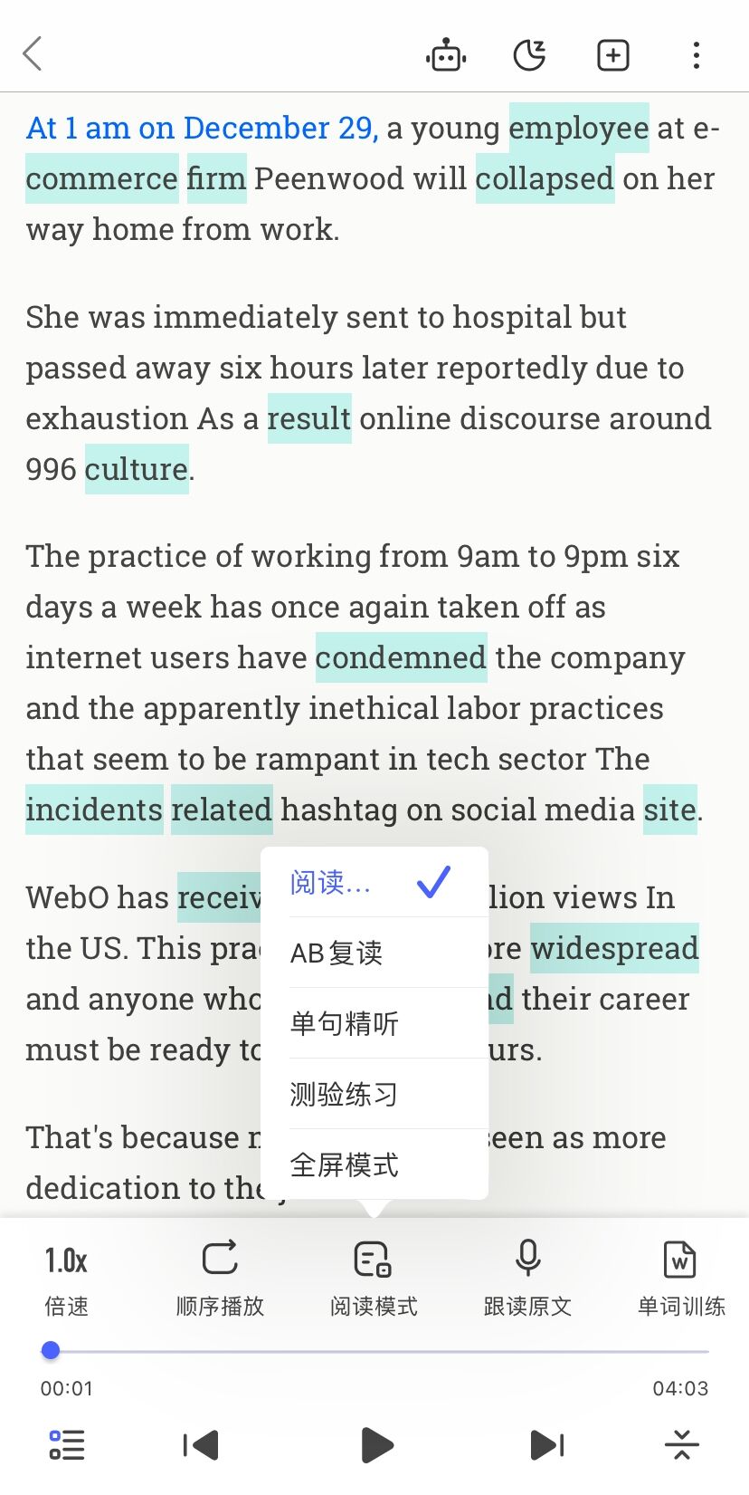 通过全新上线的AI字幕自动生成功能,我们还可以为你的听力材料制作同步高亮字幕,搭配App的倍速调节、单句精听模式,词汇智能提示等功能,助你扫清障碍,完美解决以上难题。