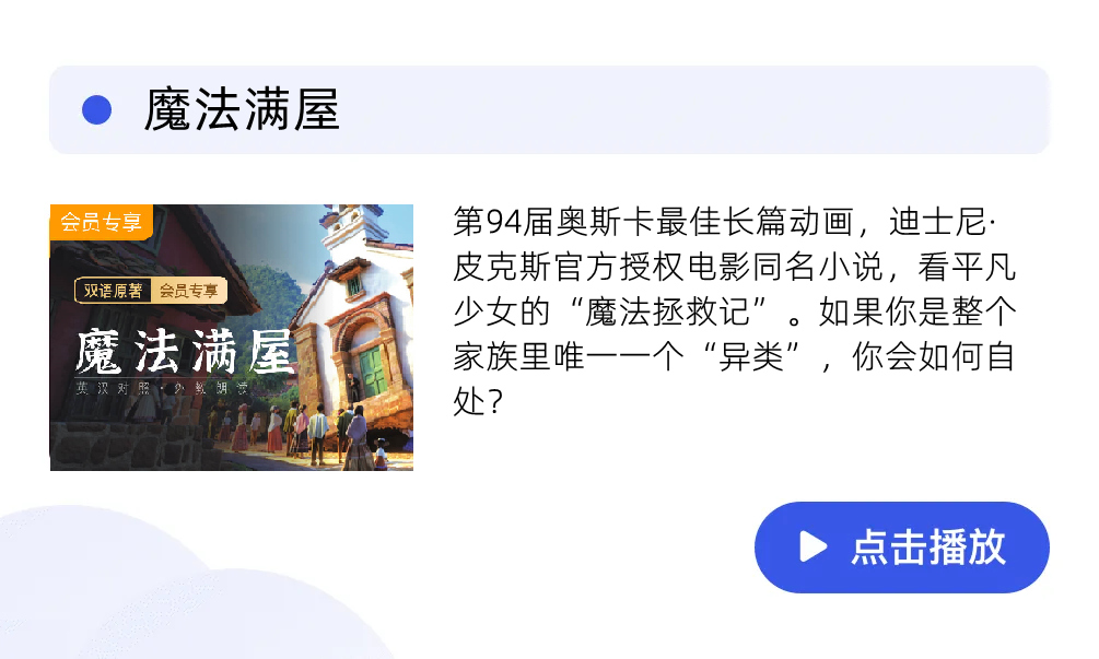 无论你有没有看过这部电影,都可以读一读《魔法满屋》的同名小说,它的生词不多,故事有趣,引人入胜,很适合初级英语学习者~