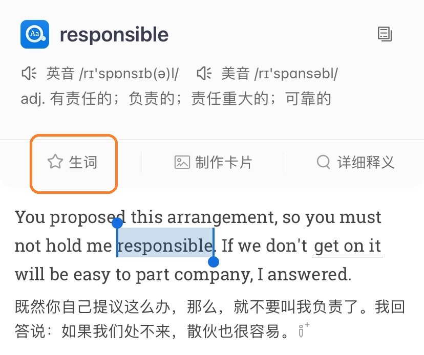 PS:阅读过程中遇到生词怎么办?不需要切换各种app去查词,只需长按选中生词,「欧路词典」即会在页面上方弹出单词的解释,还可以一键加入生词本,方便阅后复习~